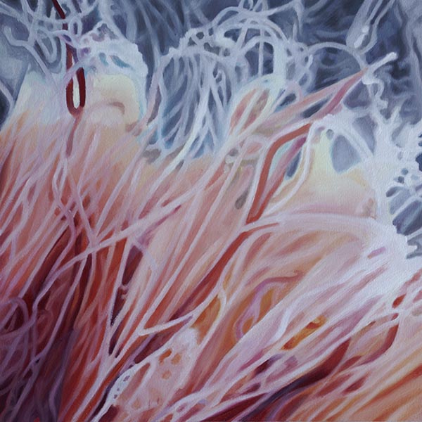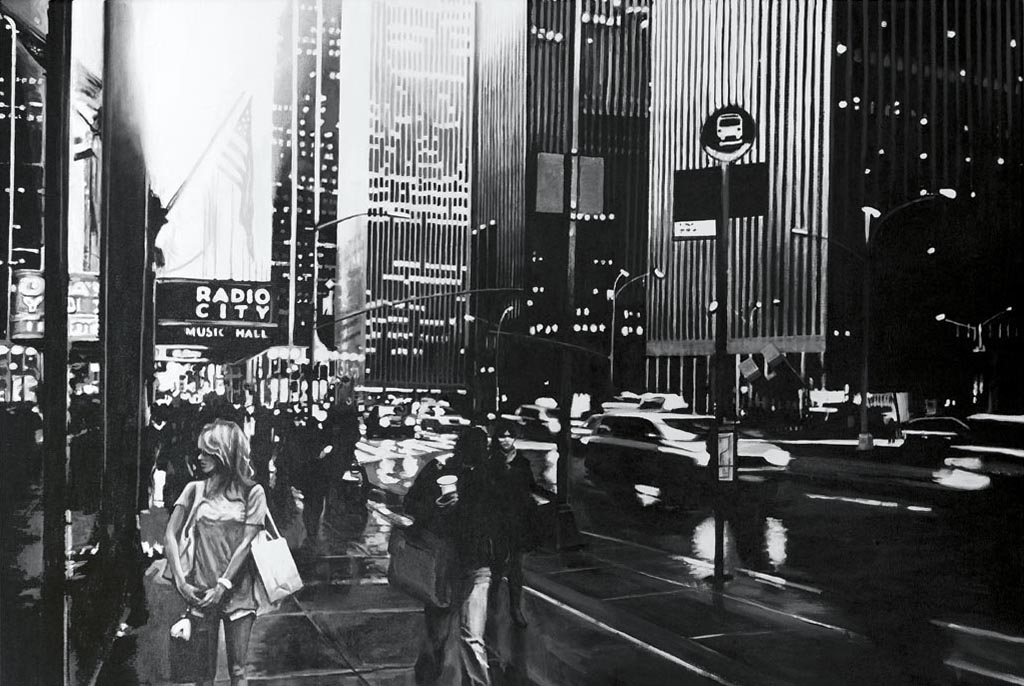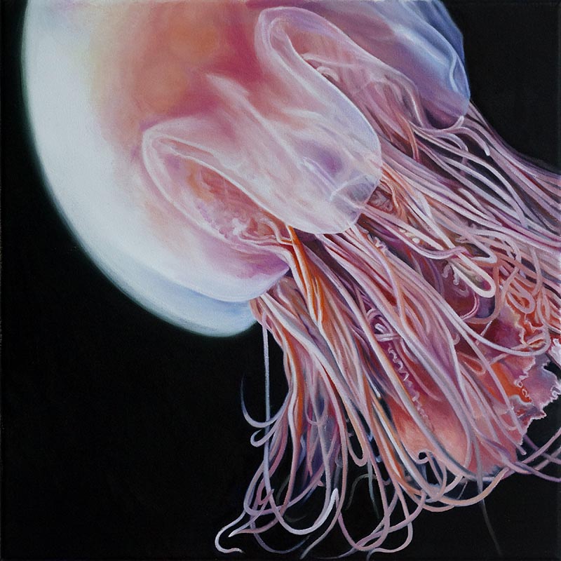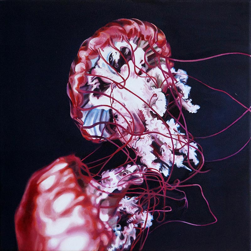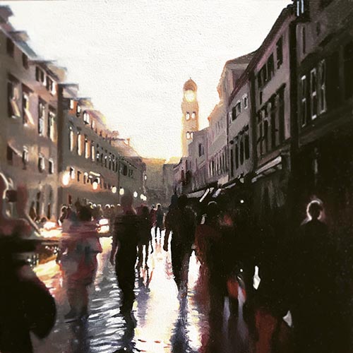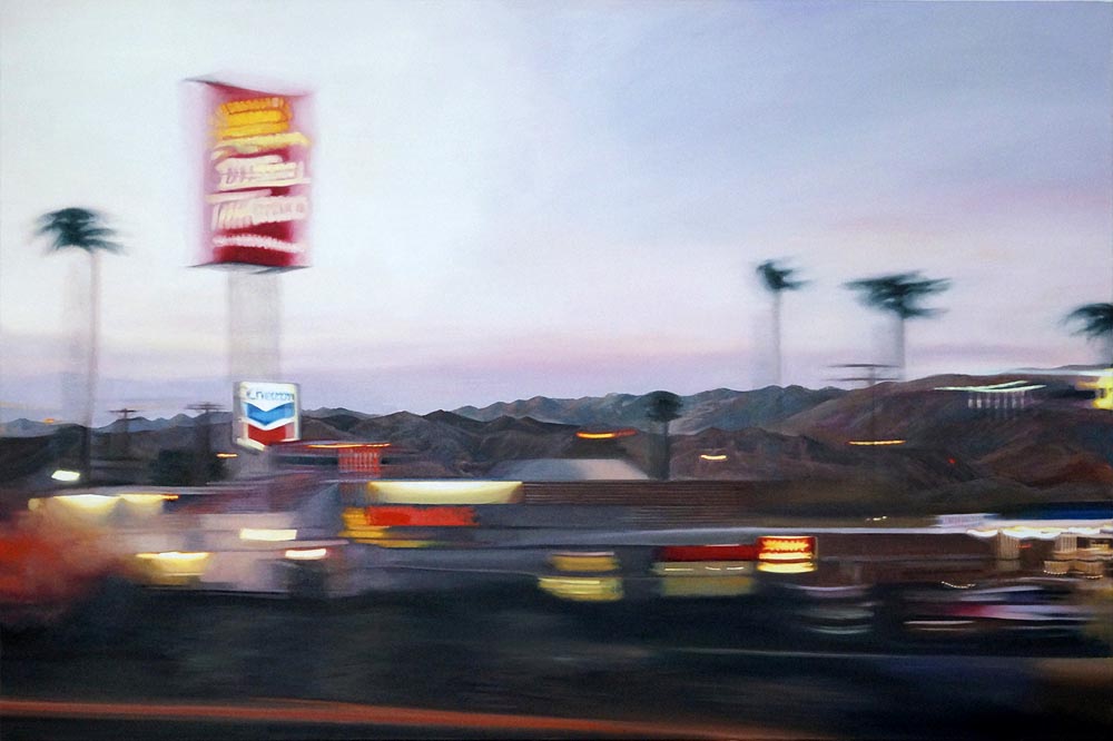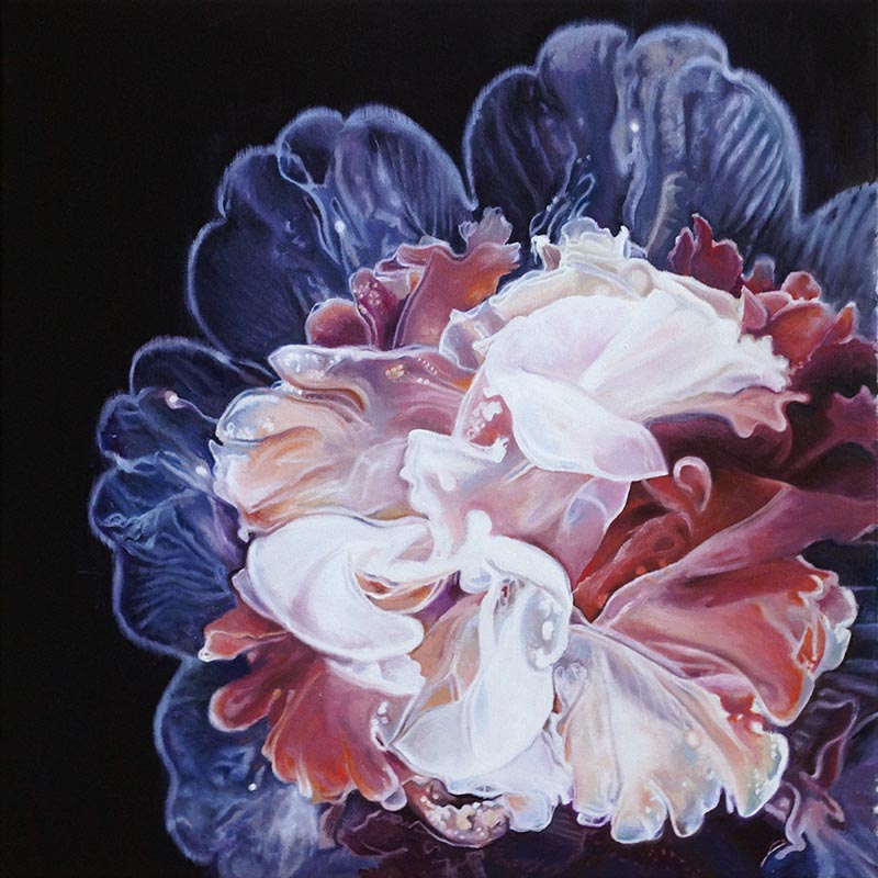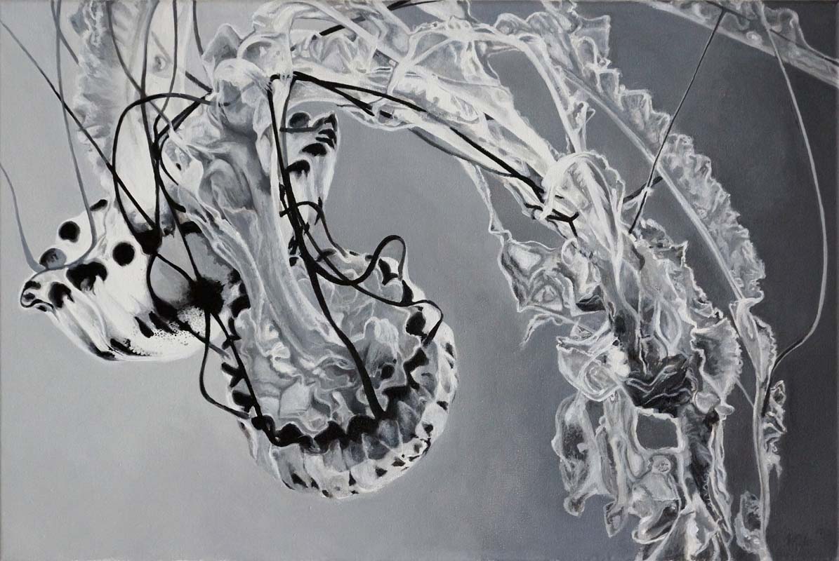 Die in Öl und Acryl gemalten Motive variieren in der Tiefe des Detailierungsgrades zwischen präzisen, statischen Stilleben und dynamischer, fl üchtiger Unschärfe die Ihre Wirkung aus dem Spiel von Licht, Schatten und Bewegung generiert. Die fotorealistische Anmutung der Bilder verändert sich dabei mit dem Standpunkt des Betrachters und entwickelt eine interessante Spannung zu der aus der Nähe wahrnehmbaren Abstraktion im Strich.
